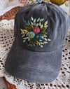 Blue and dark pink hand embroidered flowers on an adjustable dark grey fabric hat