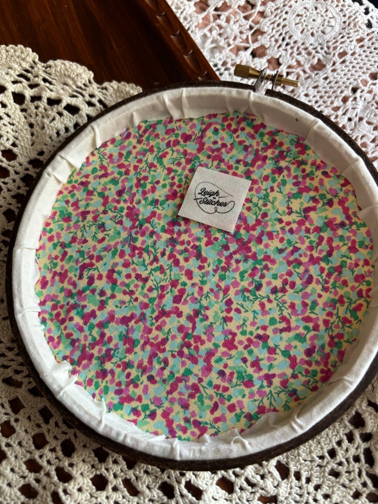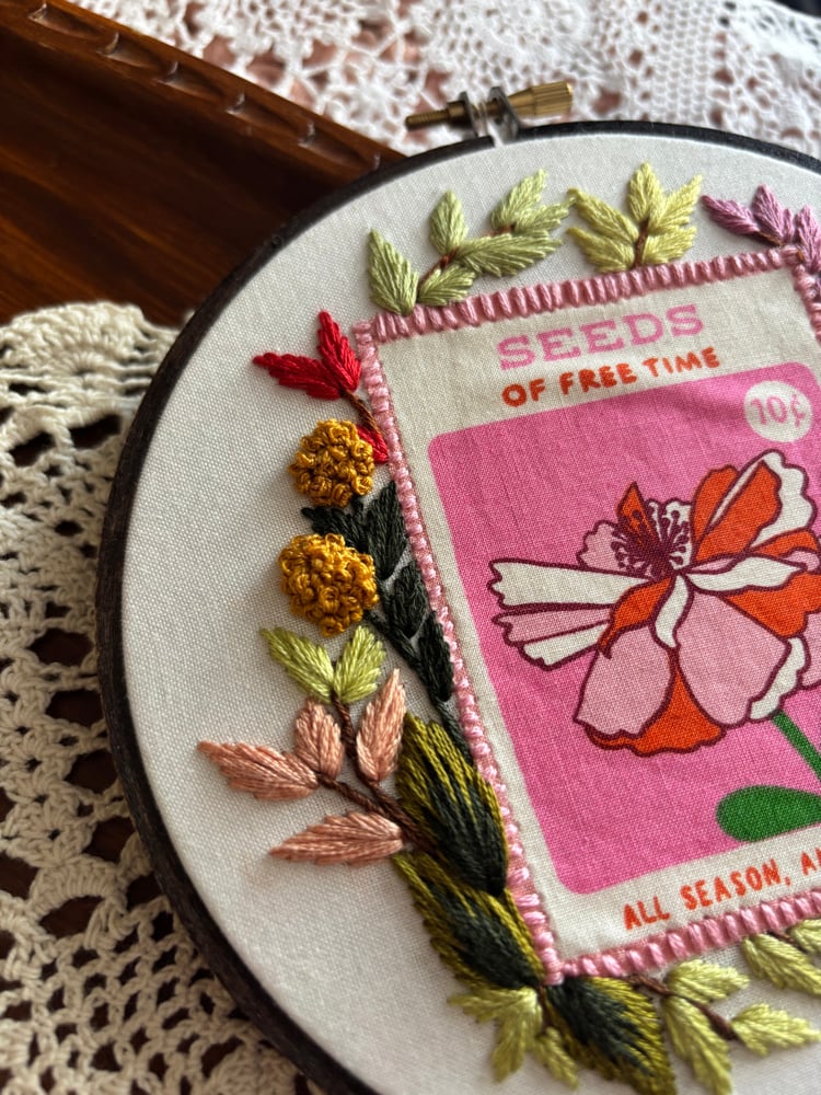This design has been hand-stitched on off-white cotton fabric. It has been framed in a stained 6” wooden embroidery hoop.