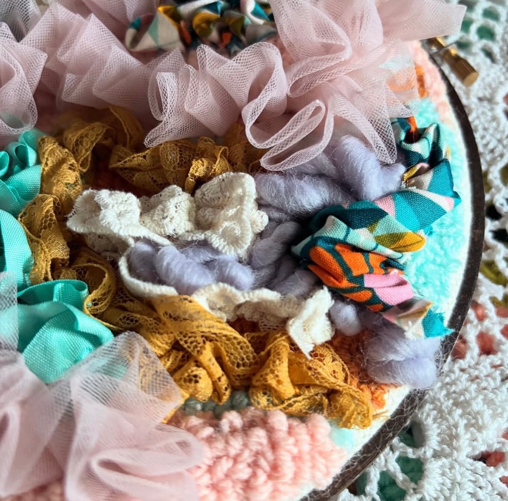 Celebrate your love of tulle, yarns, fabrics, and thread with this abstract stitched and punch needle hoop art.