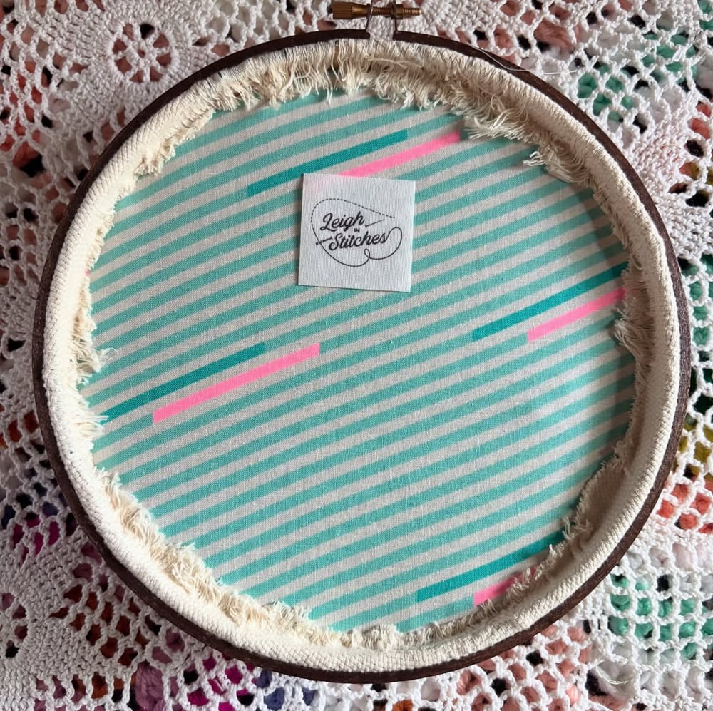 Framed in a stained wooden hoop ready to hang from the top hardware with a finishing nail.
