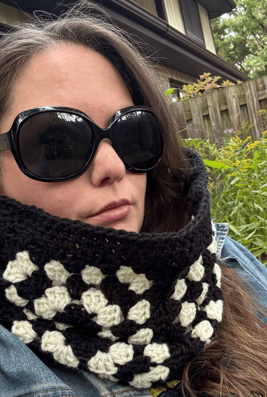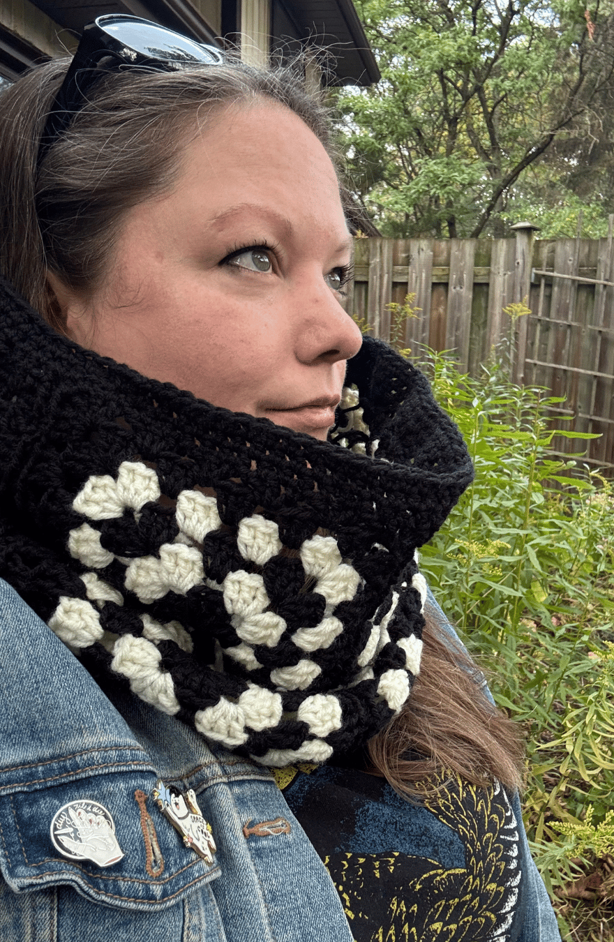 Celebrate your love of granny squares as chilly weather arrives. No more fussing with long scarves. Just toss this cowl over your head and scrunch down to keep your neck warm or pull it up to protect your ears in cold weather!