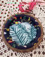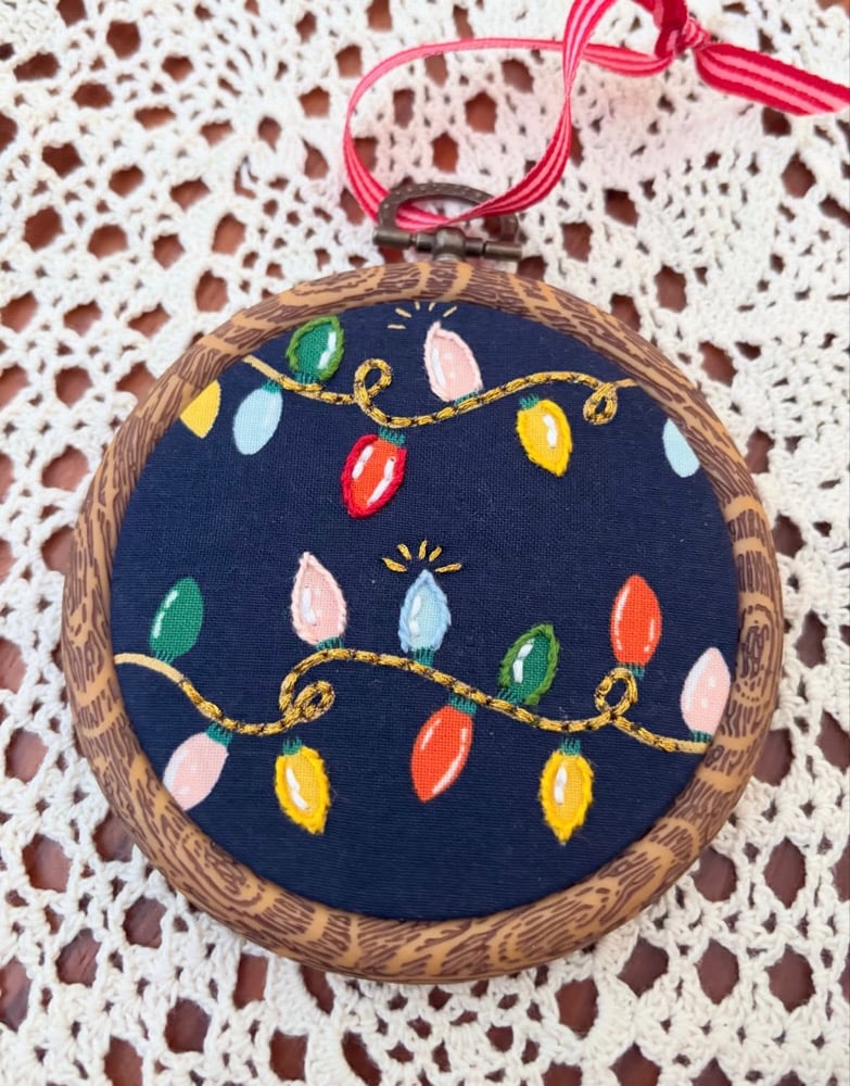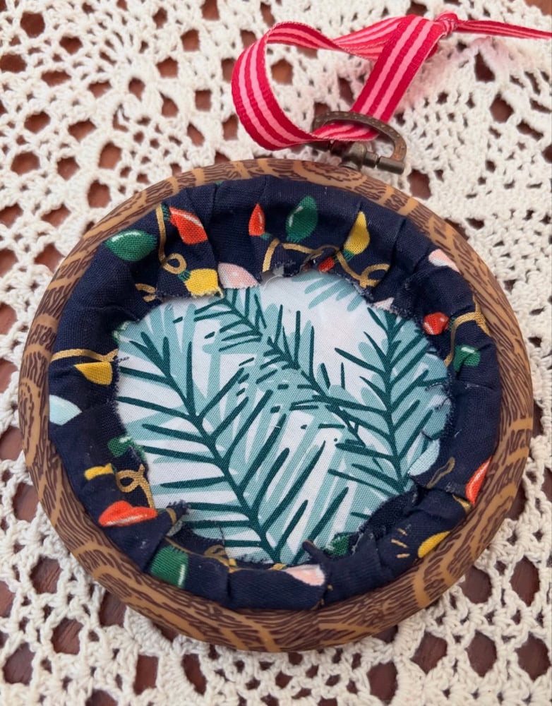 Hand stitched embroidery has been added to added to patterned fabric. Some metallic thread adds a little shine.