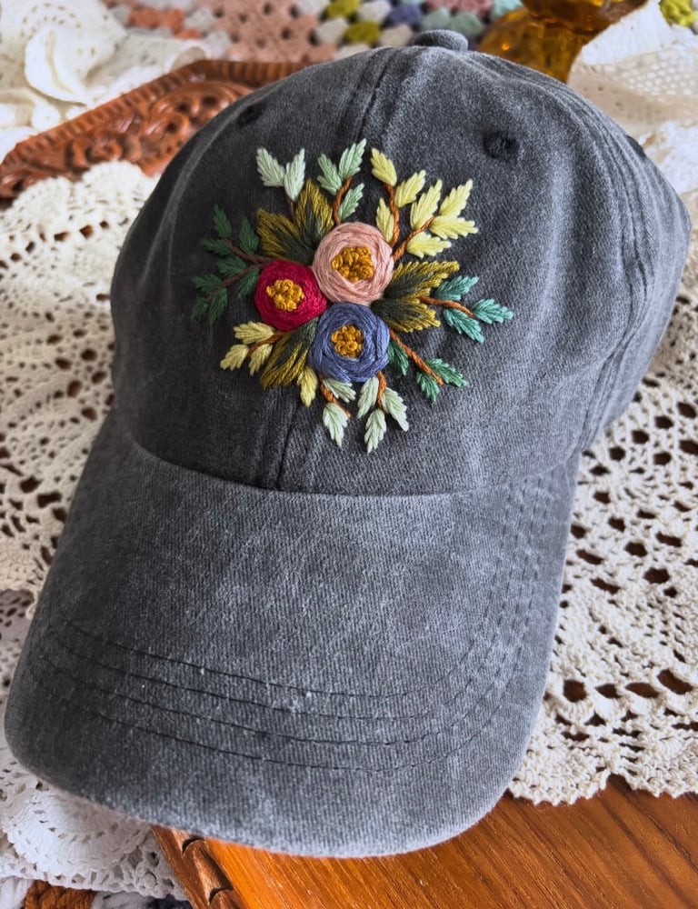 Dark red, blue, and light pink hand embroidered flowers on an adjustable dark grey fabric hat