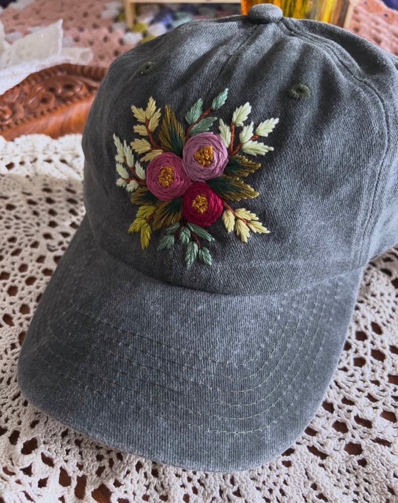 A dark green fabric dad-style hat featuring a hand-stitched floral design. The hat is adjustable, ensuring a comfortable fit for most people.