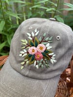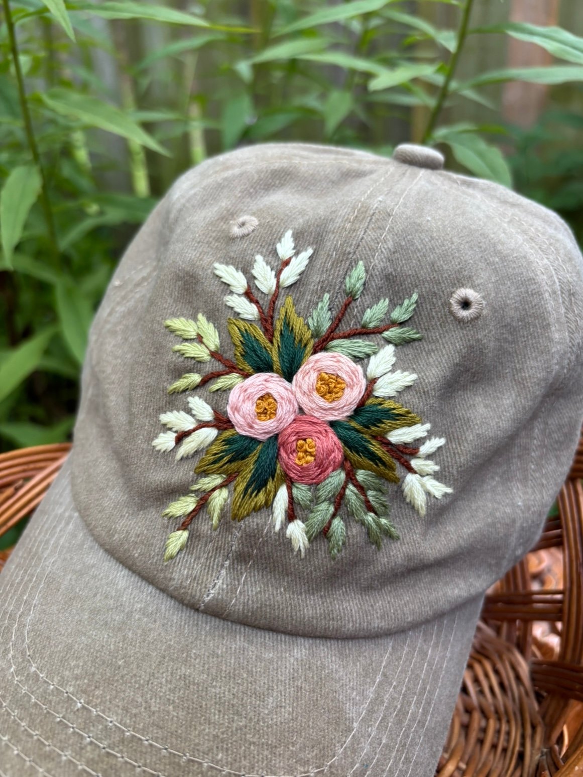 A dad-style hat featuring a hand-stitched floral design. The hat is adjustable, ensuring a comfortable fit for most people.