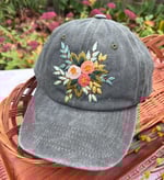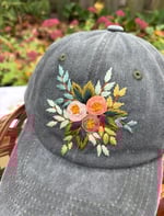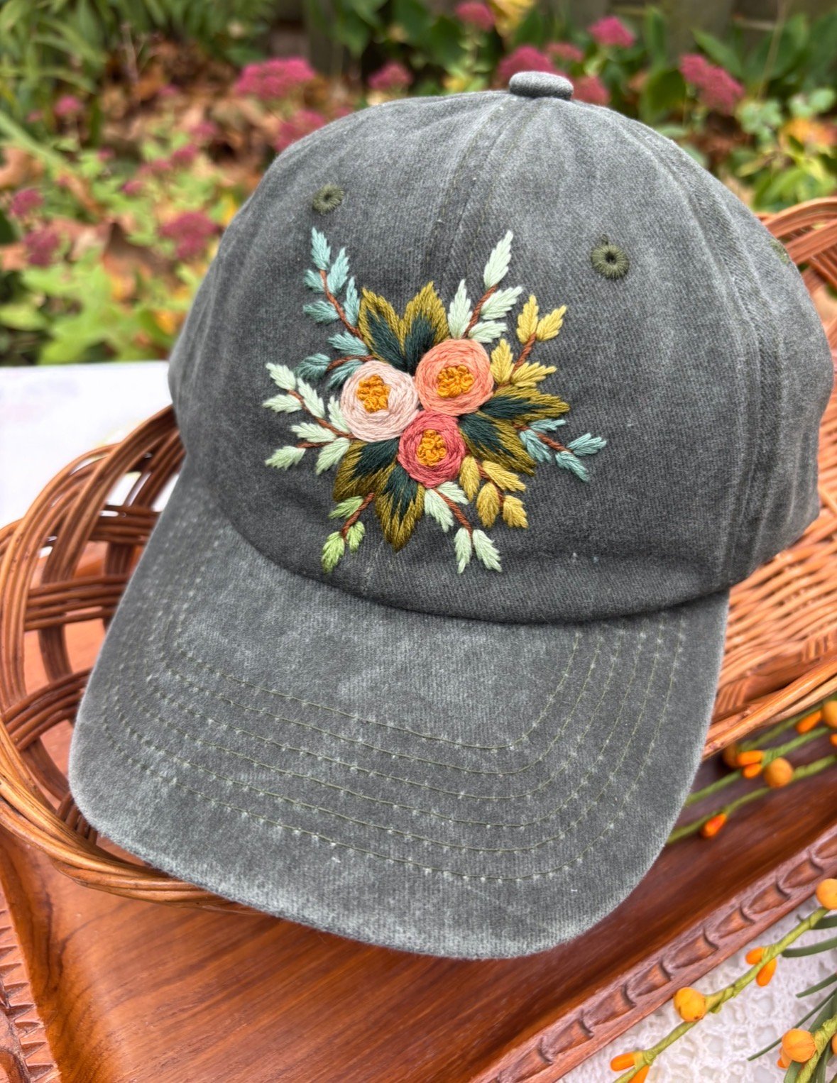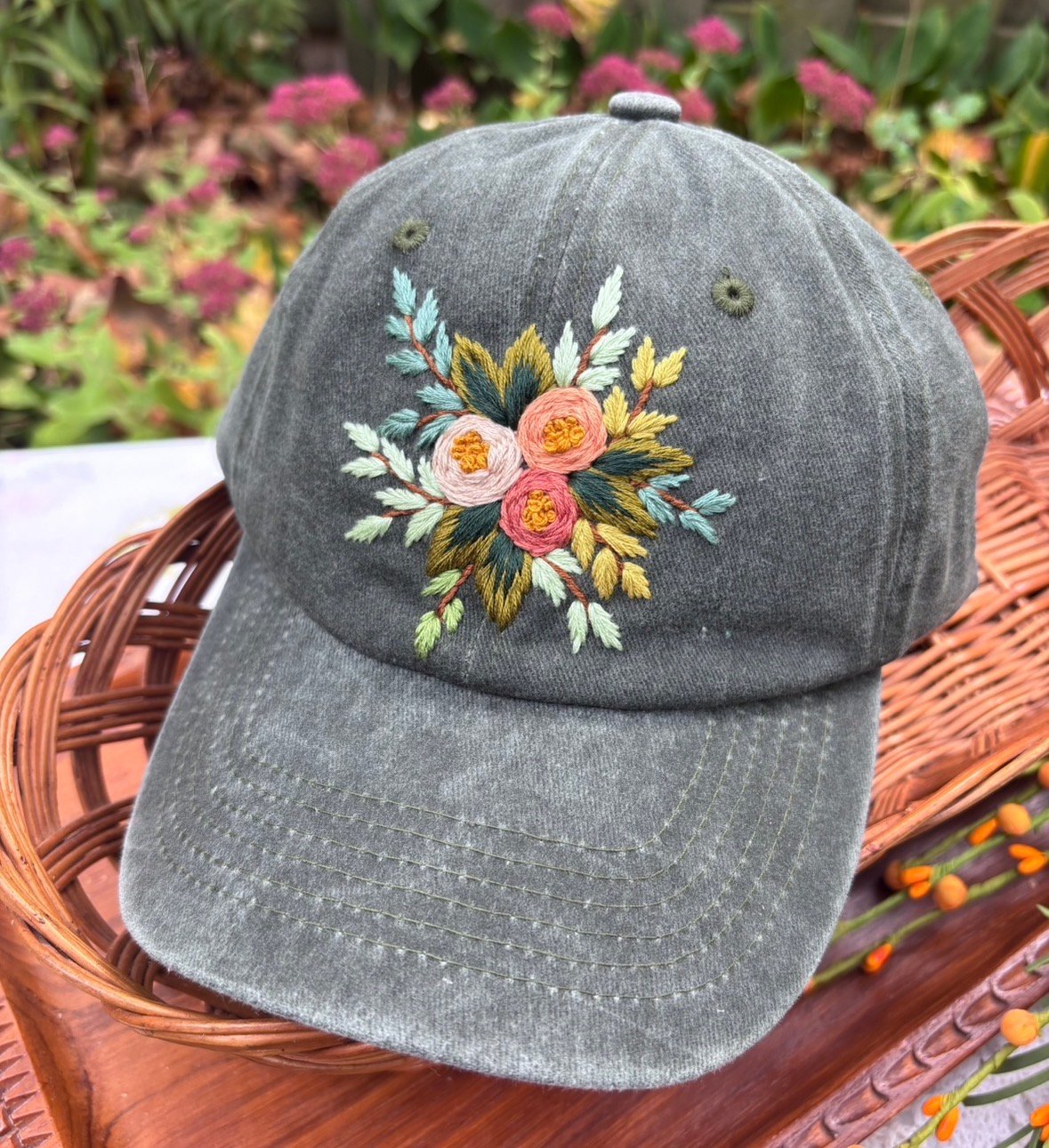 A dark green fabric dad-style hat featuring a hand-stitched floral design. The hat is adjustable, ensuring a comfortable fit for most people.