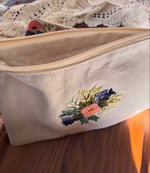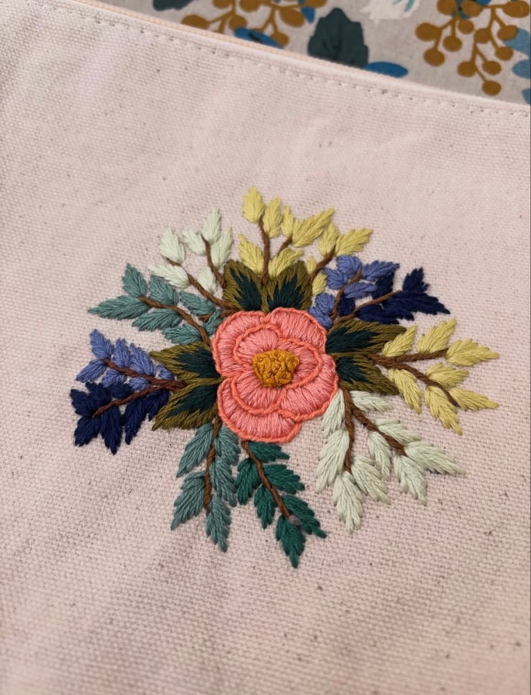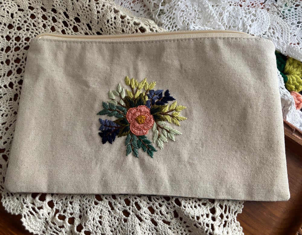 Regan (A Bit Stitchy) stitched a zippered pouch using cotton canvas on the outside and cotton on the inside. Then I added hand stitched florals on the outside of the bag so you can carry embroidery wherever you go!