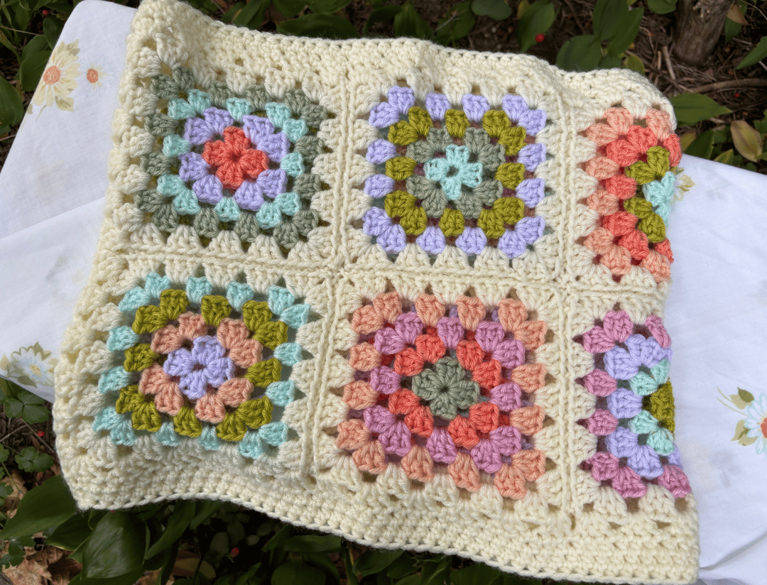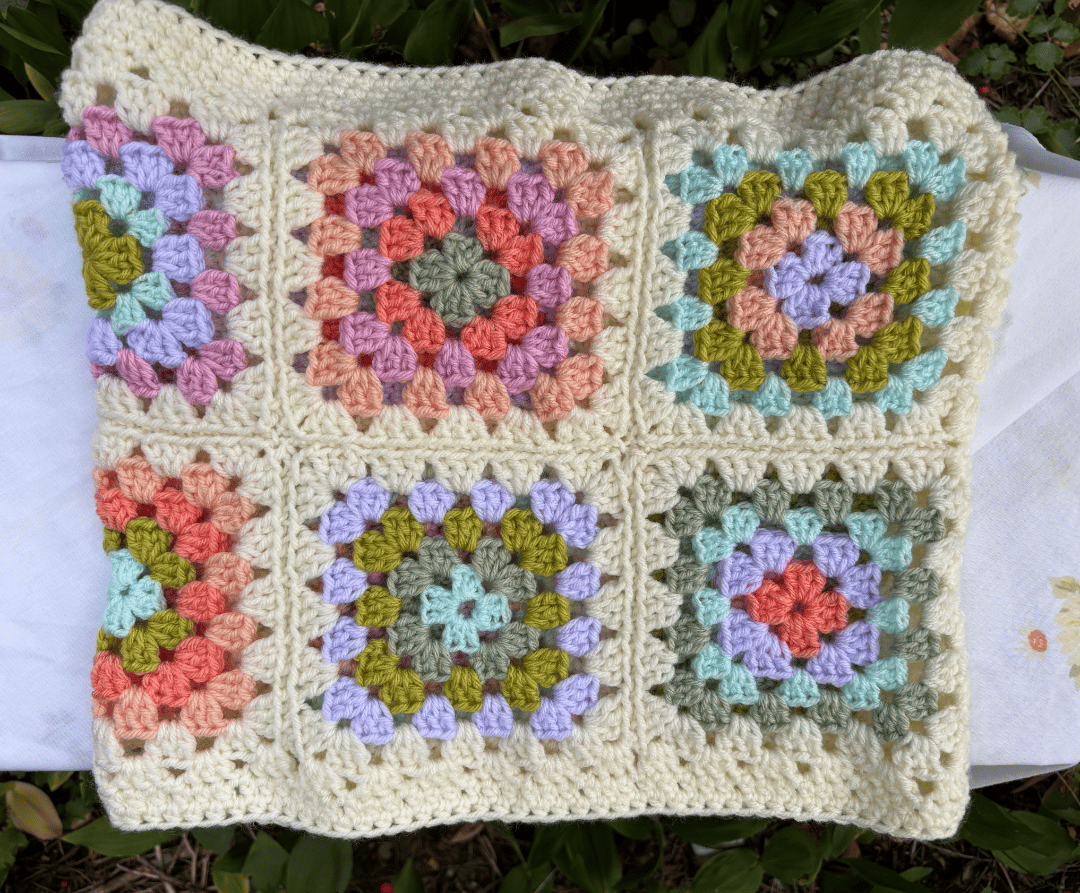 Celebrate your love of granny squares as chilly weather arrives. A mix of pastel colours surrounded by off-white yarn.