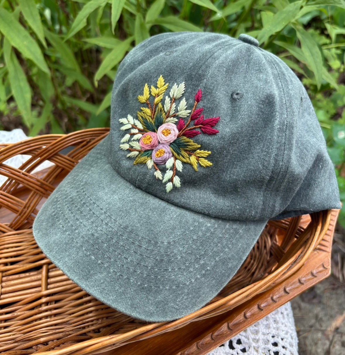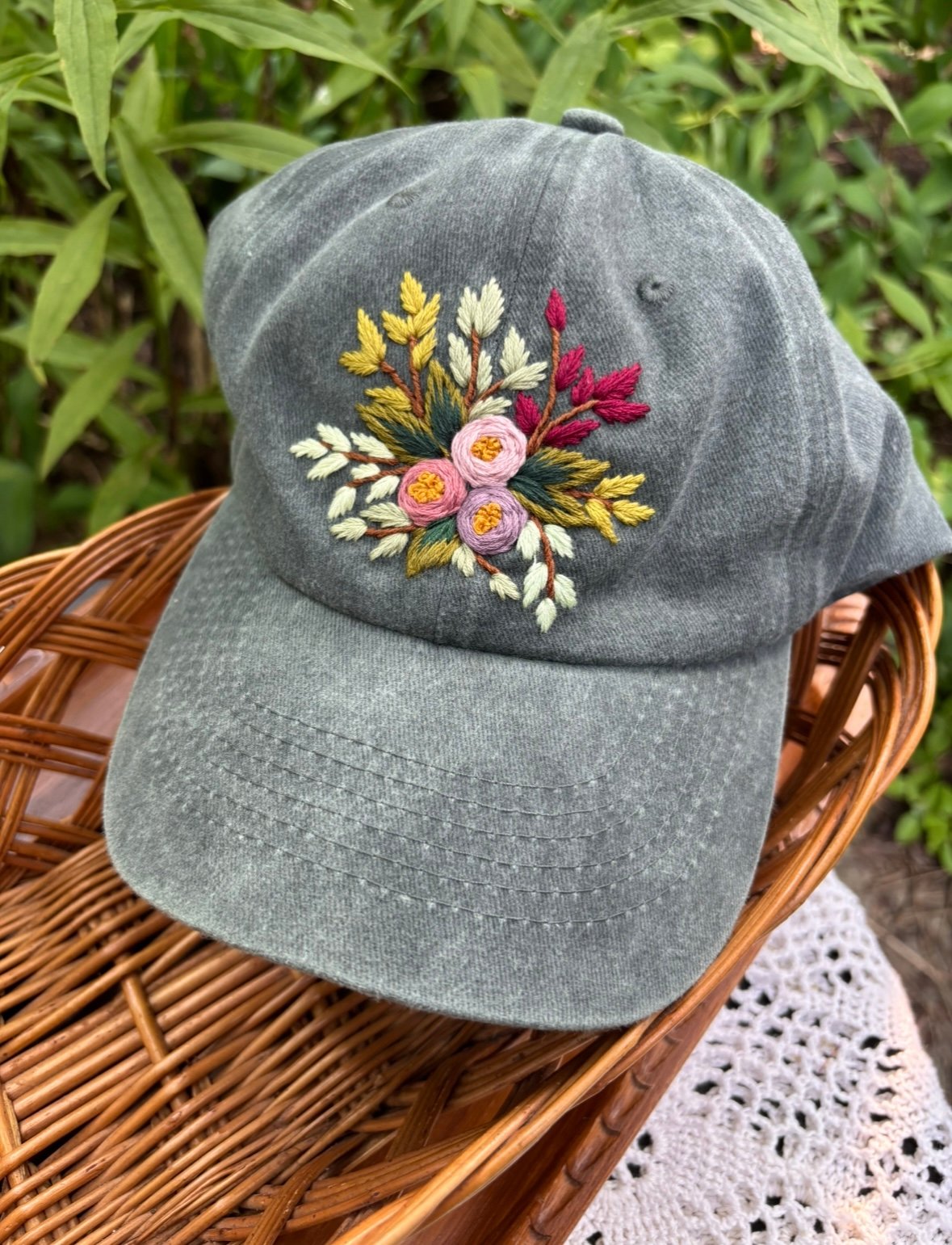 A dad-style hat featuring a hand-stitched floral design. The hat is adjustable, ensuring a comfortable fit for most people.