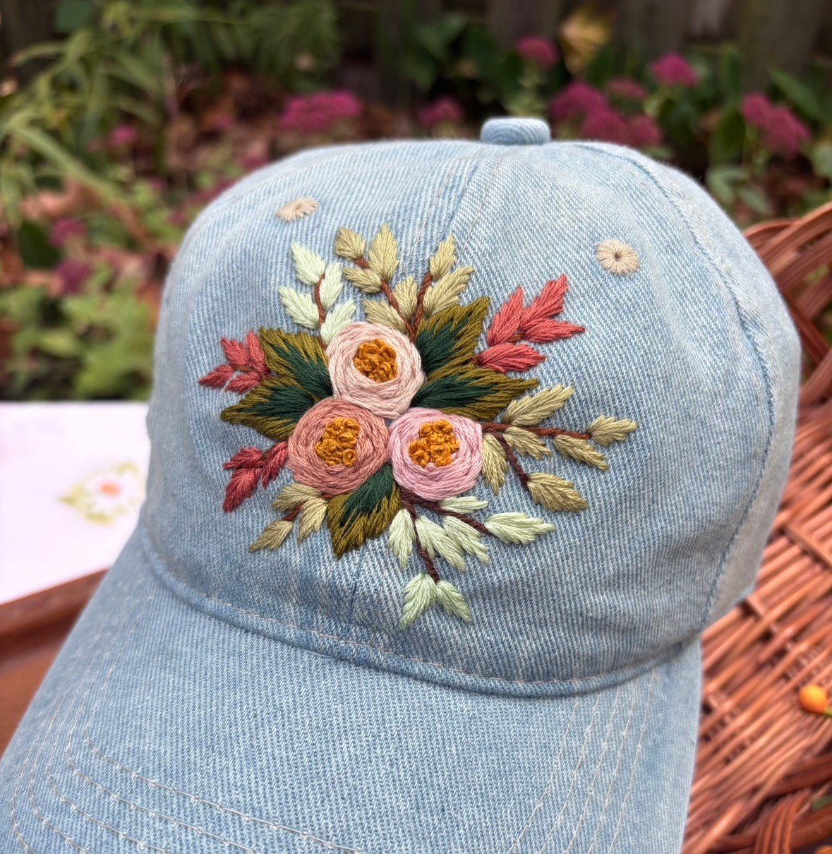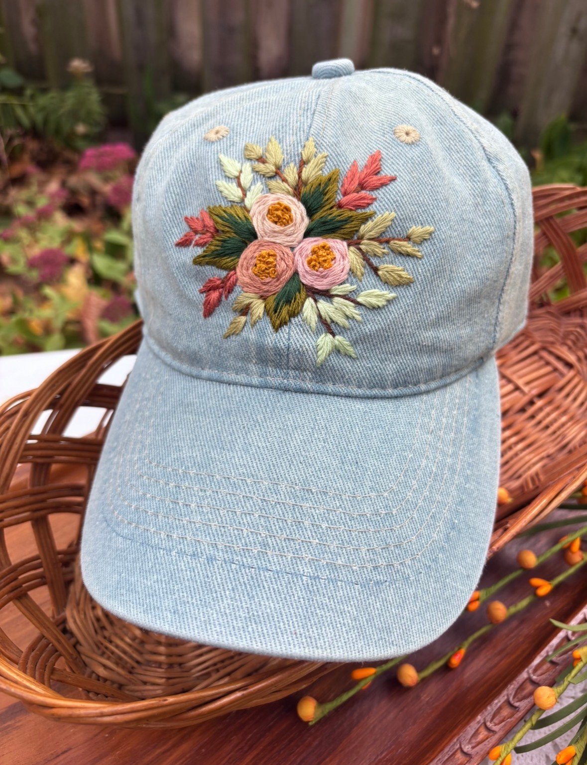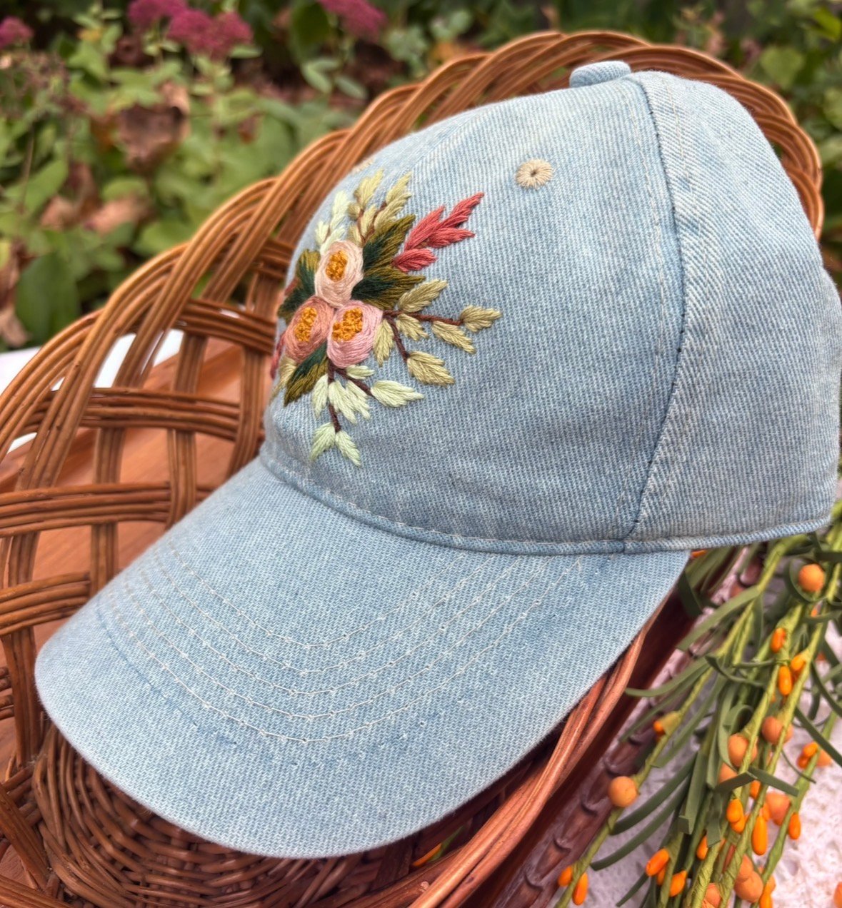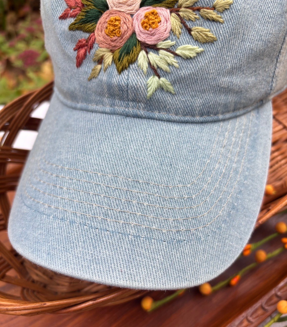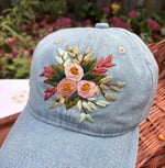 A light blue jean fabric dad-style hat featuring a hand-stitched floral design. The hat is adjustable, ensuring a comfortable fit for most people.