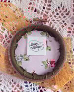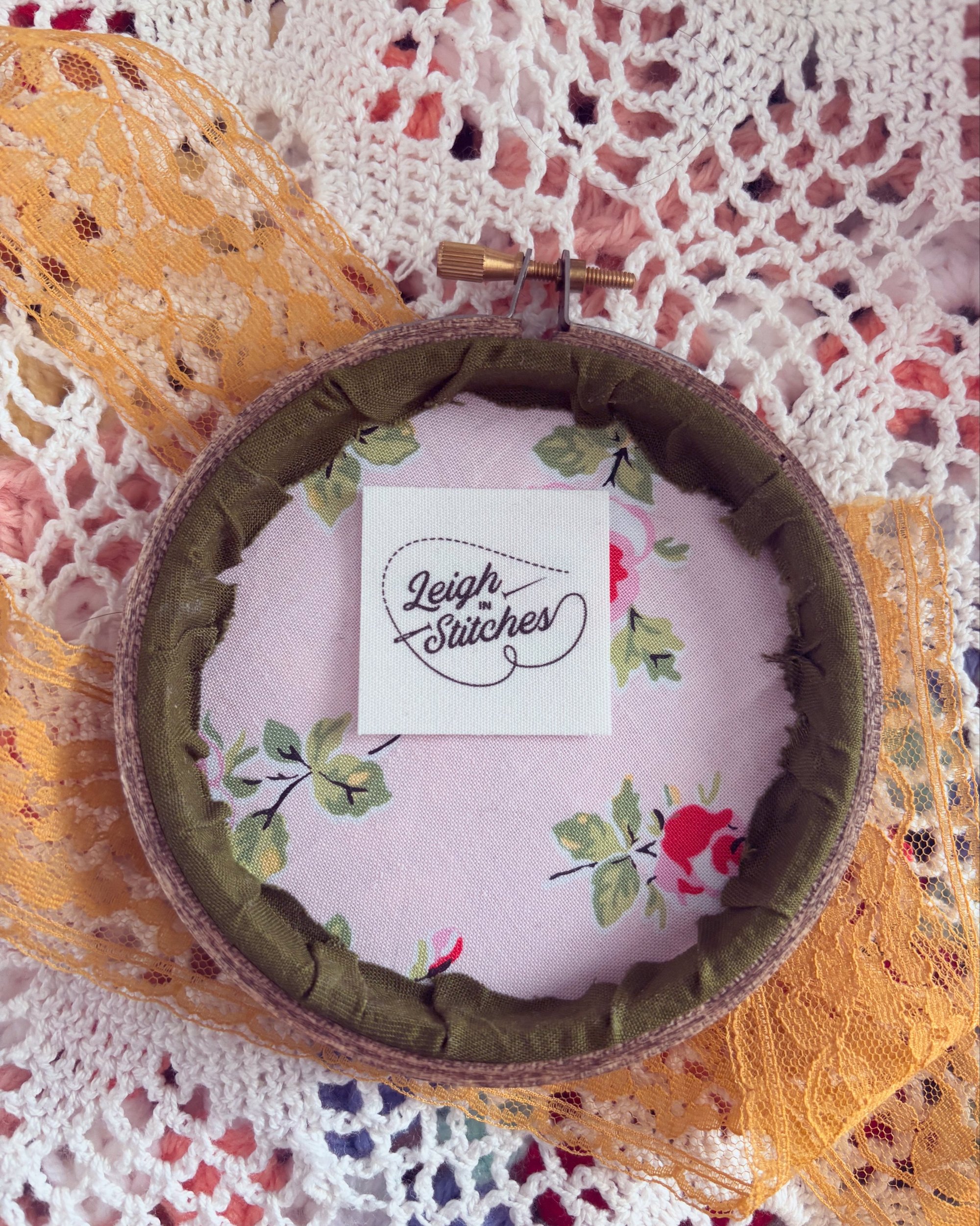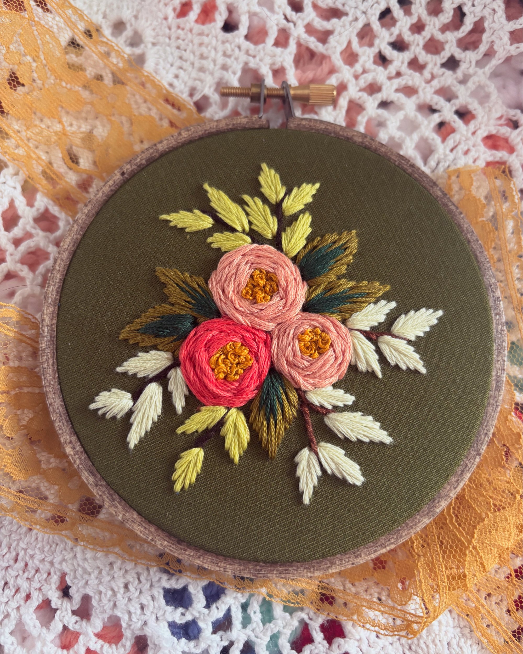 Pink flowers have been hand stitched onto green fabric and framed in a stained 4” wooden embroidery hoop. Please see the last picture for the colour of the backing fabric.